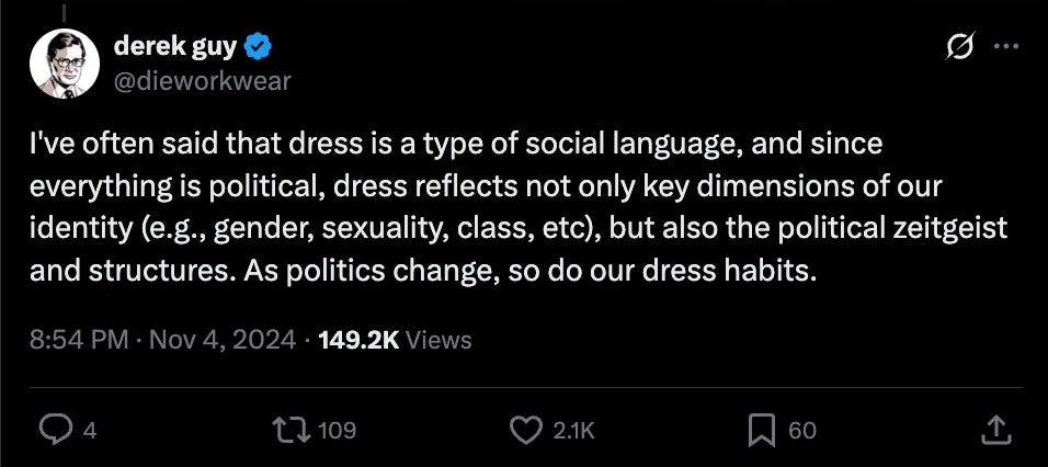 Derek Guy, also known as the internet’s “menswear guy,” often argues that dress is a form of social language. Natural, small-batch, minimally processed fabric and clothes have had a history long before our current microplastic hellscape.