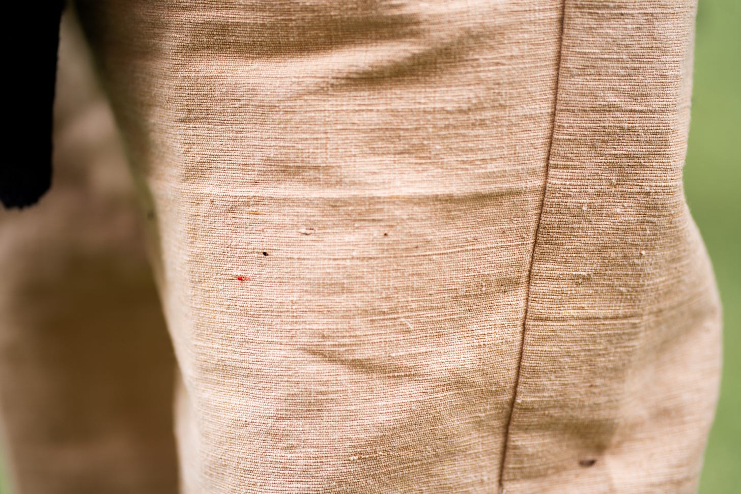 You could, theoretically, make a handloomed khaki pant, but the khadi-khakis would have flecks of black and white from the unprocessed seeds on the surface, the usually rigid diagonal twill would be broken into uneven lines of varying thickness, and the weave itself would be looser. That’s because, when all of the processing of the fibers is done by hand, it’s impossible to maintain precise tension, torque, and force like a machine could.
